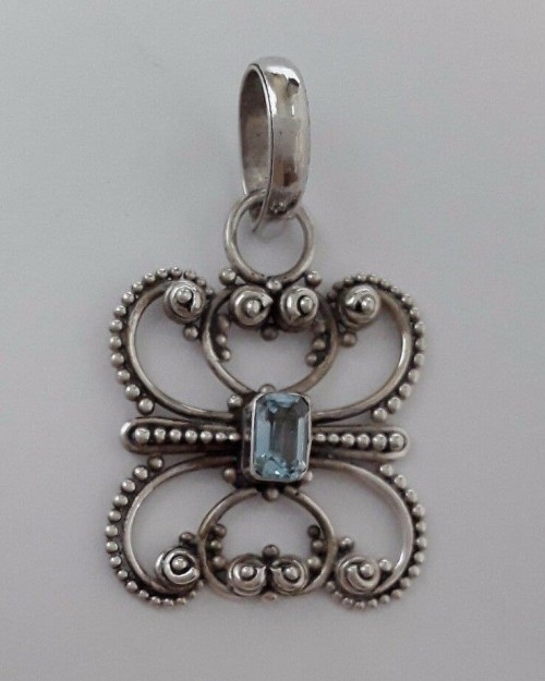 Créateur : Mes Bijoux and coPendentif Vintage en Argent Massif finement ouvragé par un travail ajouré Pendentif réhaussé d'une Topaze bleue taille rectangulaire à facettes Finition Antique