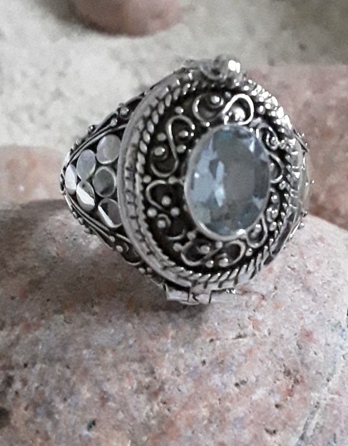 Créateur : Freddy & CoBague Poison en Argent Massif ornée d'une Topaze Bleue Taille ronde à facettes Bague à secret avec un compartiment qui s'ouvre par un capot à charnière et se ferme par un petit loquet L'intérieur mesure 6,8 mm Bague joliment ouvragée autour de la Pierre et sur chaque côté - Modèle original de BagueTAILLE : 56-57