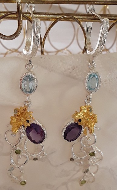 Créateur : Agnès Créations Longues Boucles d'oreilles en Argent 925 (poinçon) finement ouvragées Boucles ornées d'une Améthyste & d'une Topaze Bleue ovale à bords facettés 3 fins Péridots sertissent la Bague Réhauts d'or jaune pour un bel éclat