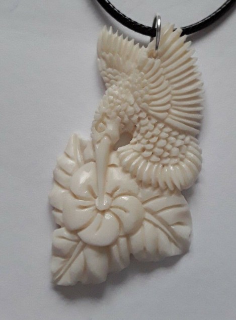 Pendentif en os de Buffle sculpté représentant un Oiseau & une Fleur